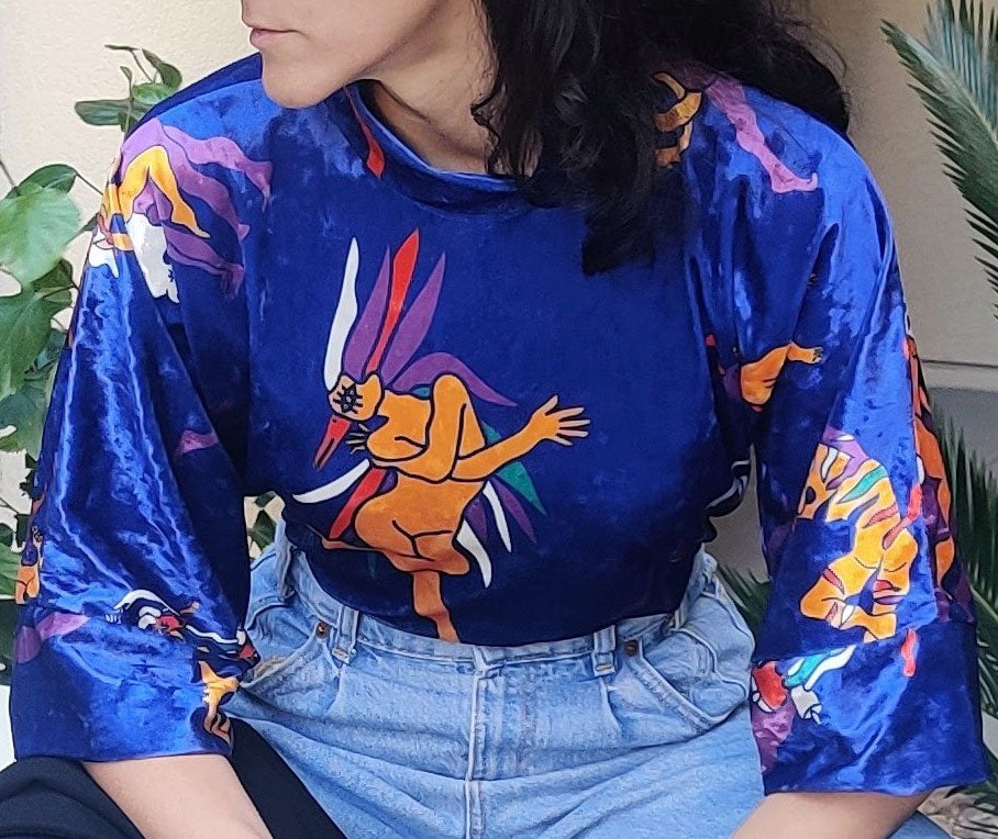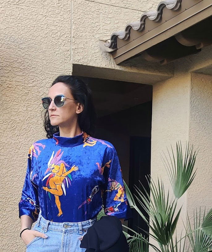 Син дамски дизайнерски топ, дизайнерски принт, ексклузивна плюшена материя, ръчно изработен от Hellena за колекцията Superheroes