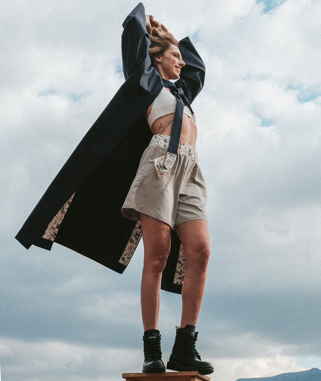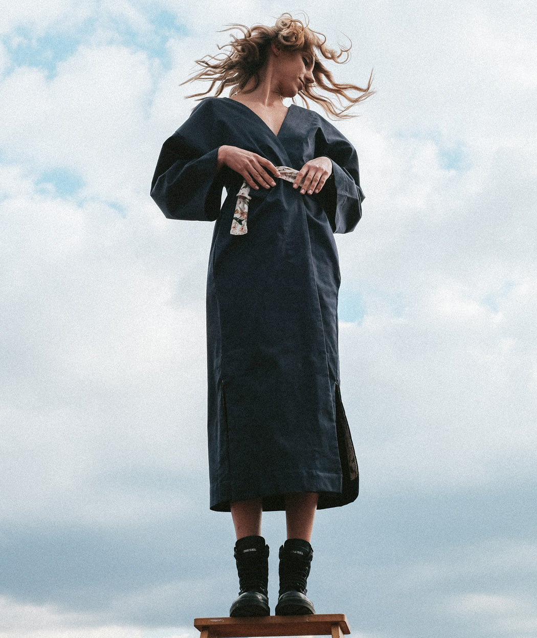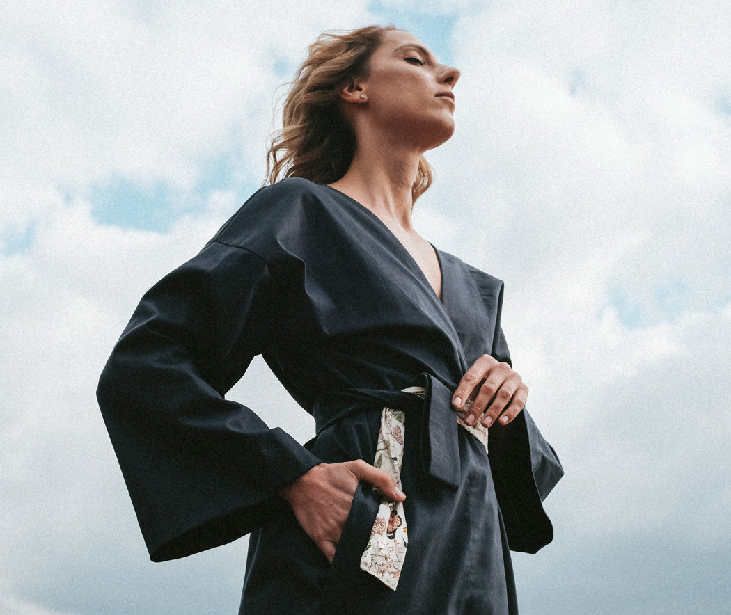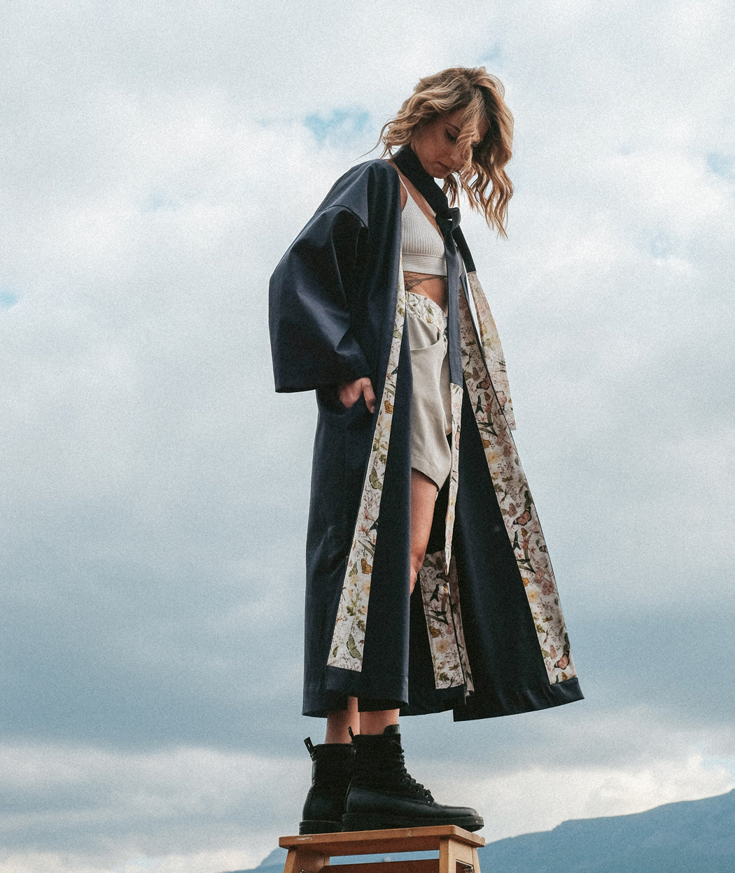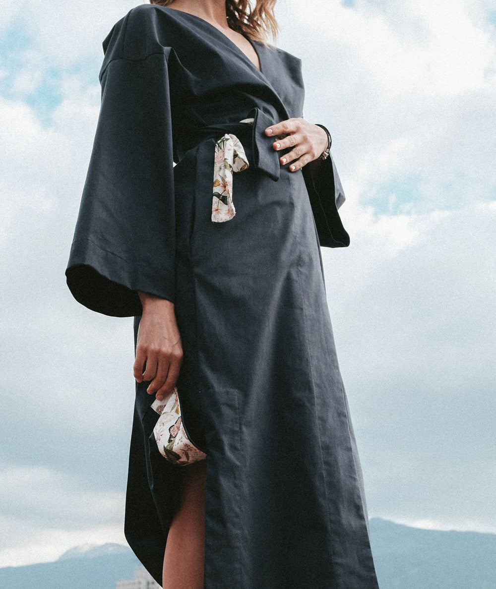 Дълго тъмносиньо кимоно, мека тенсел материя, традиционен японски стил, джобове и дизайнерски акценти от вътрешната страна, елегантно и стилно