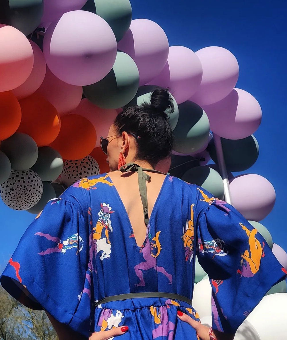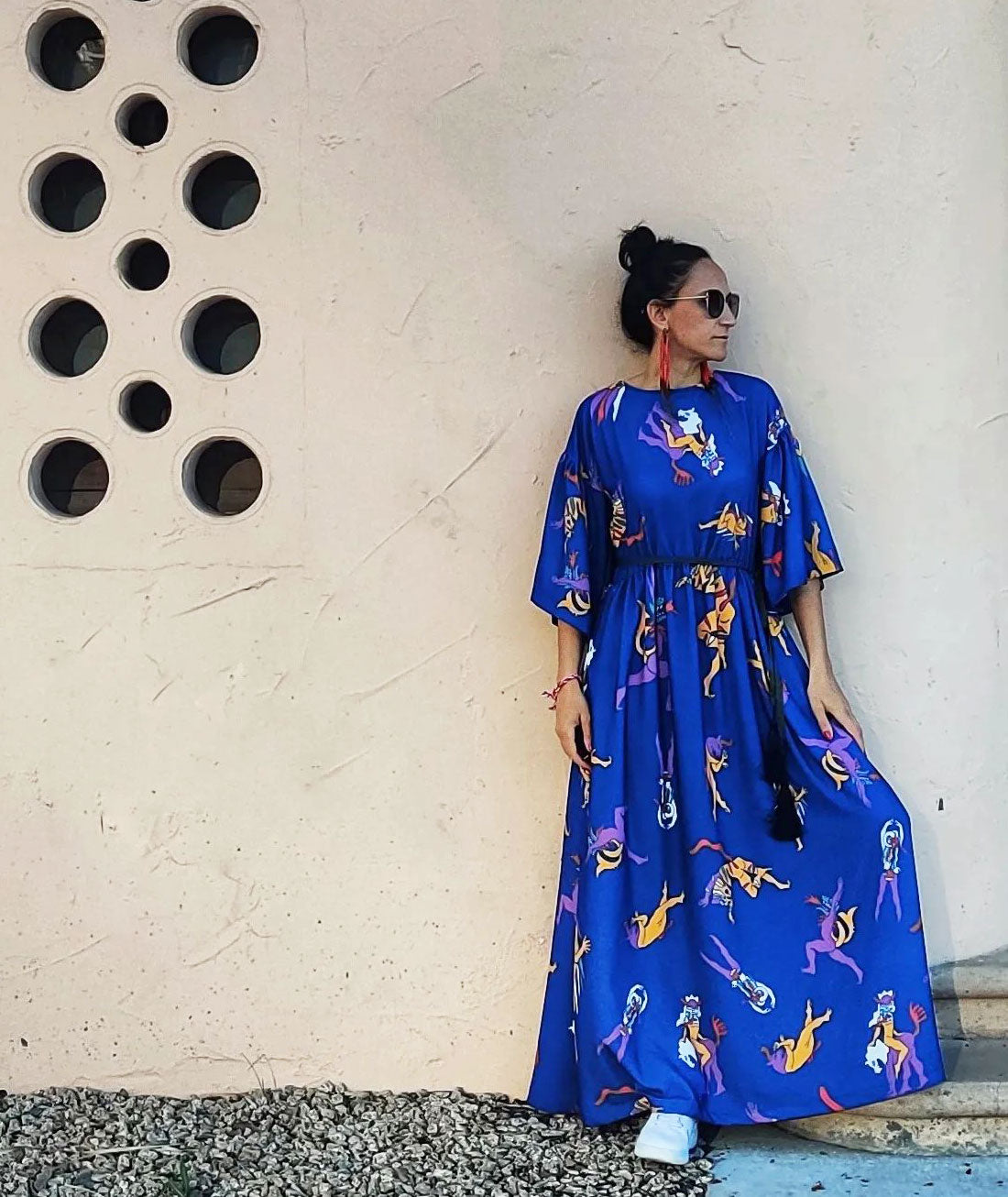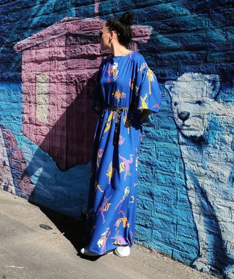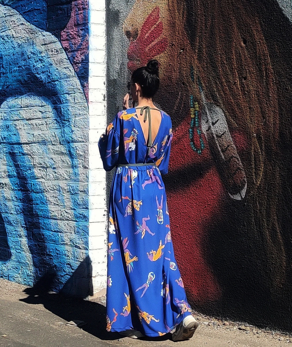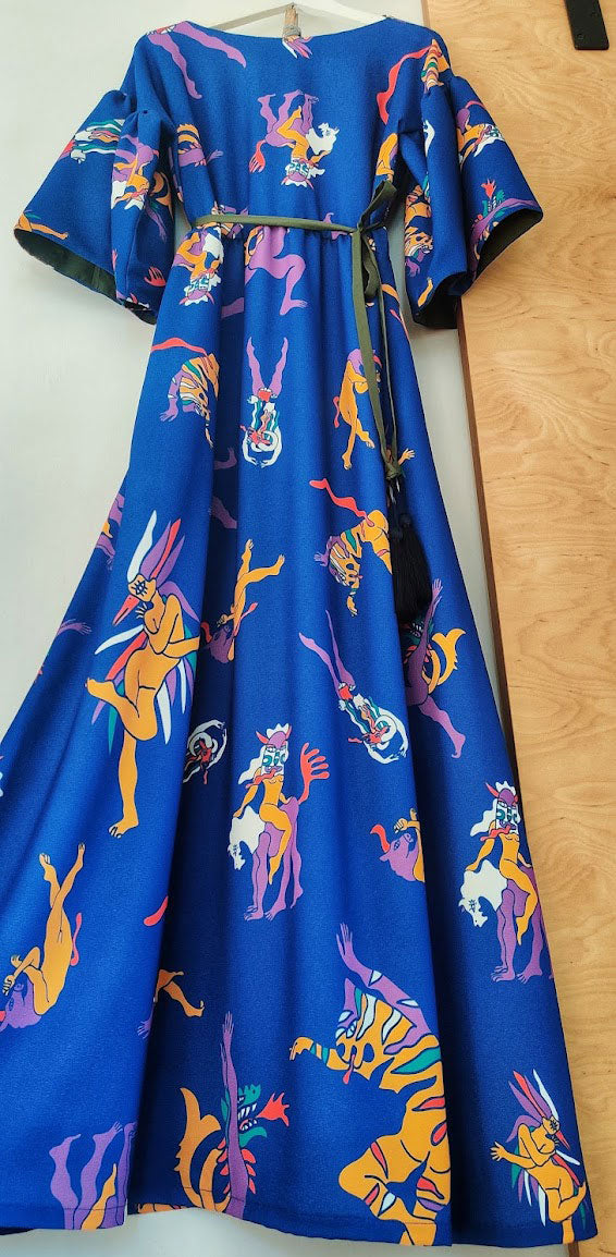 Дълга дизайнерска рокля, дизайнерски принт, ексклузивна плюшена материя, ръчно изработена от Hellena за колекцията Superheroes