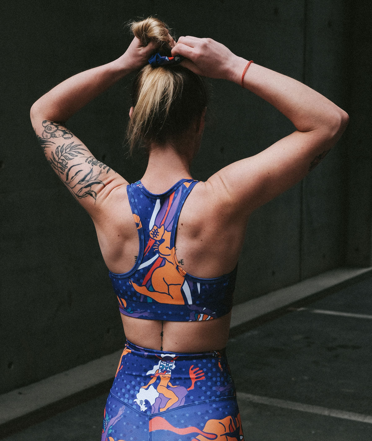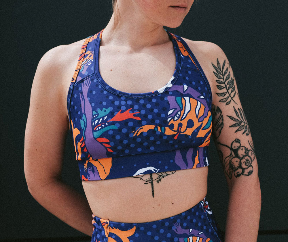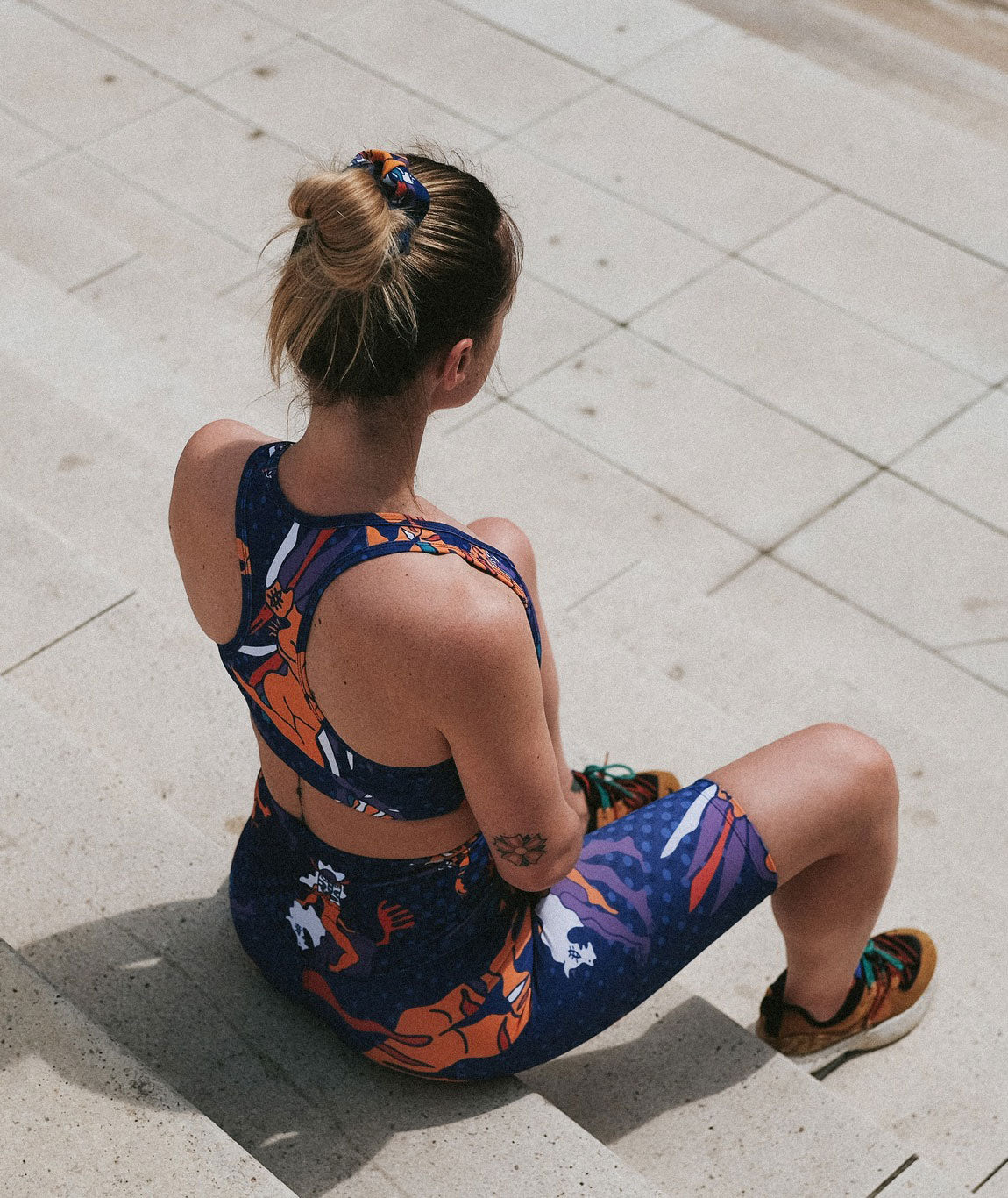 Дамско спортно бюстие, дизайнерски принт, ексклузивен спортен стил, ръчна изработка от Hellena за колекцията Superheroes