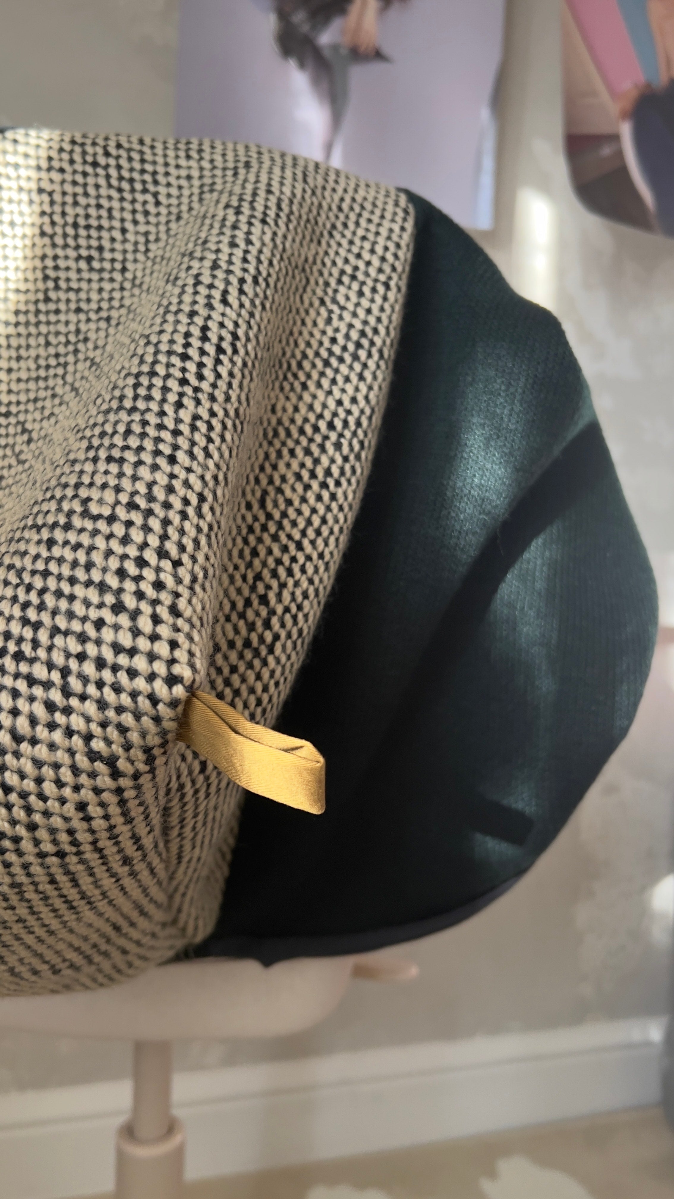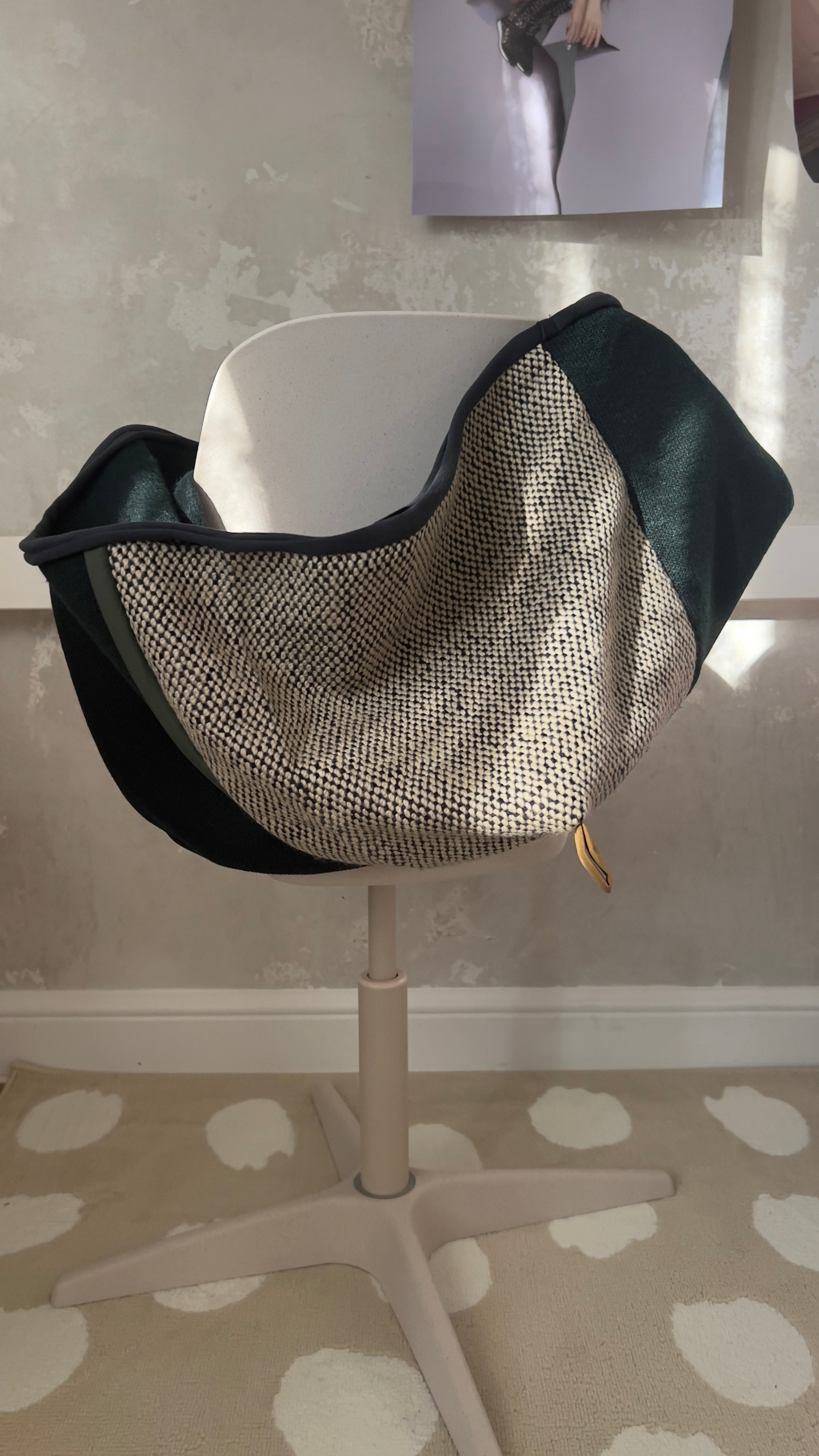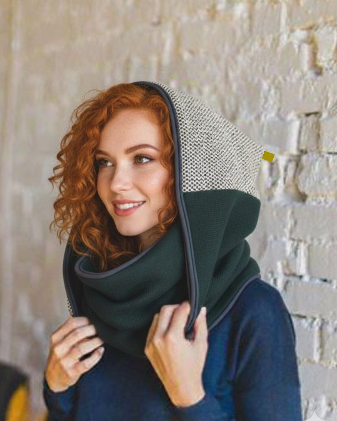 Crafting:  Designed and handmade by Artelie - long, cozy and warm reversible unisex scarf  Unique design created in limited series Model:  Double-faced, large infinity scarf - wear on both sides Infinity hooded scarf, Spacious, warm, comfortable Christmas Gift favorite Material:  Soft warm dark green machine knitted fabric, combined with black and white warm wool upper part on the hood. Infinity...