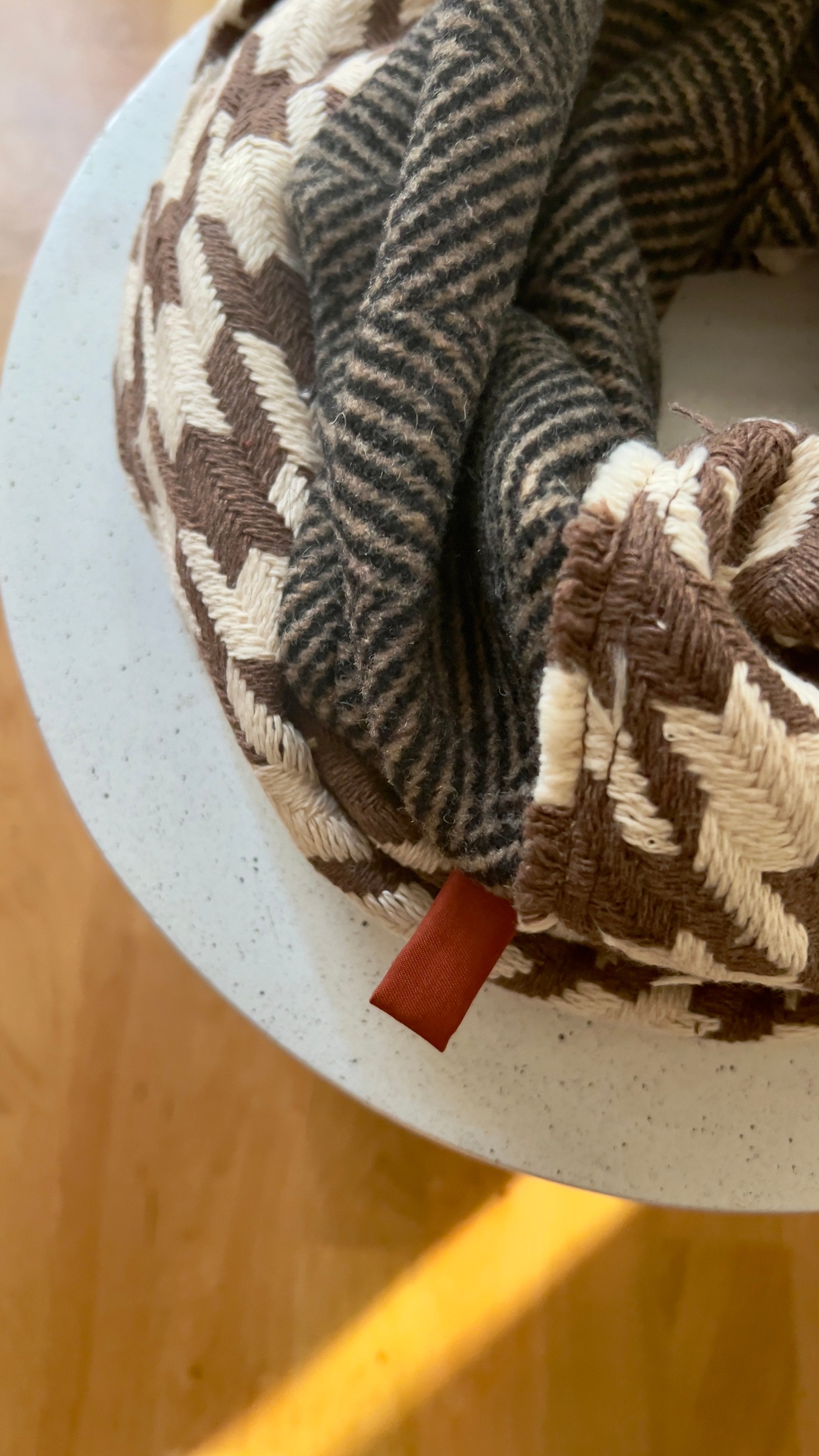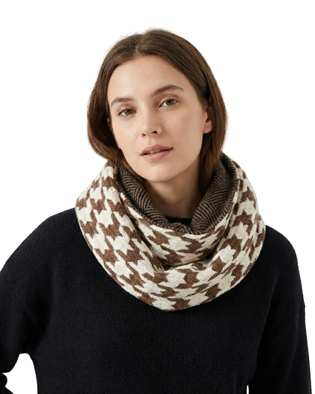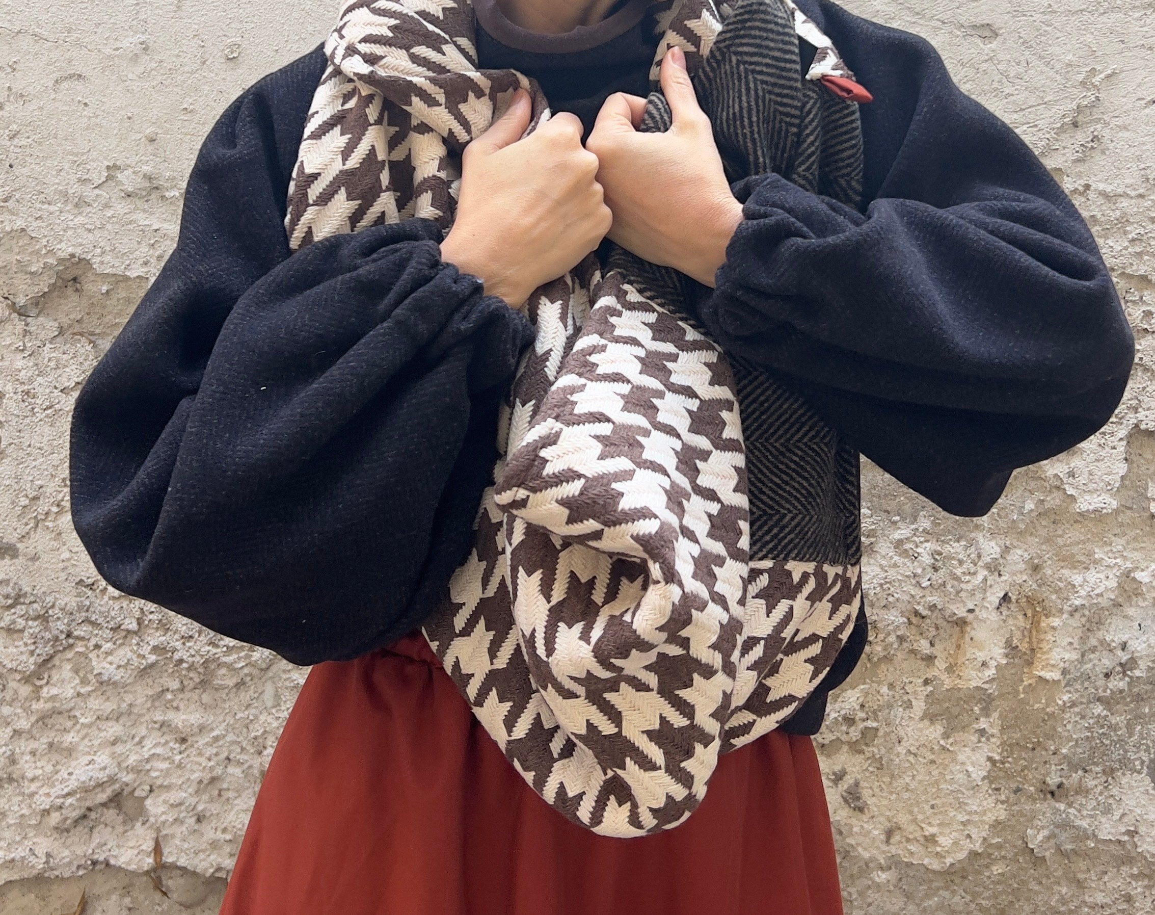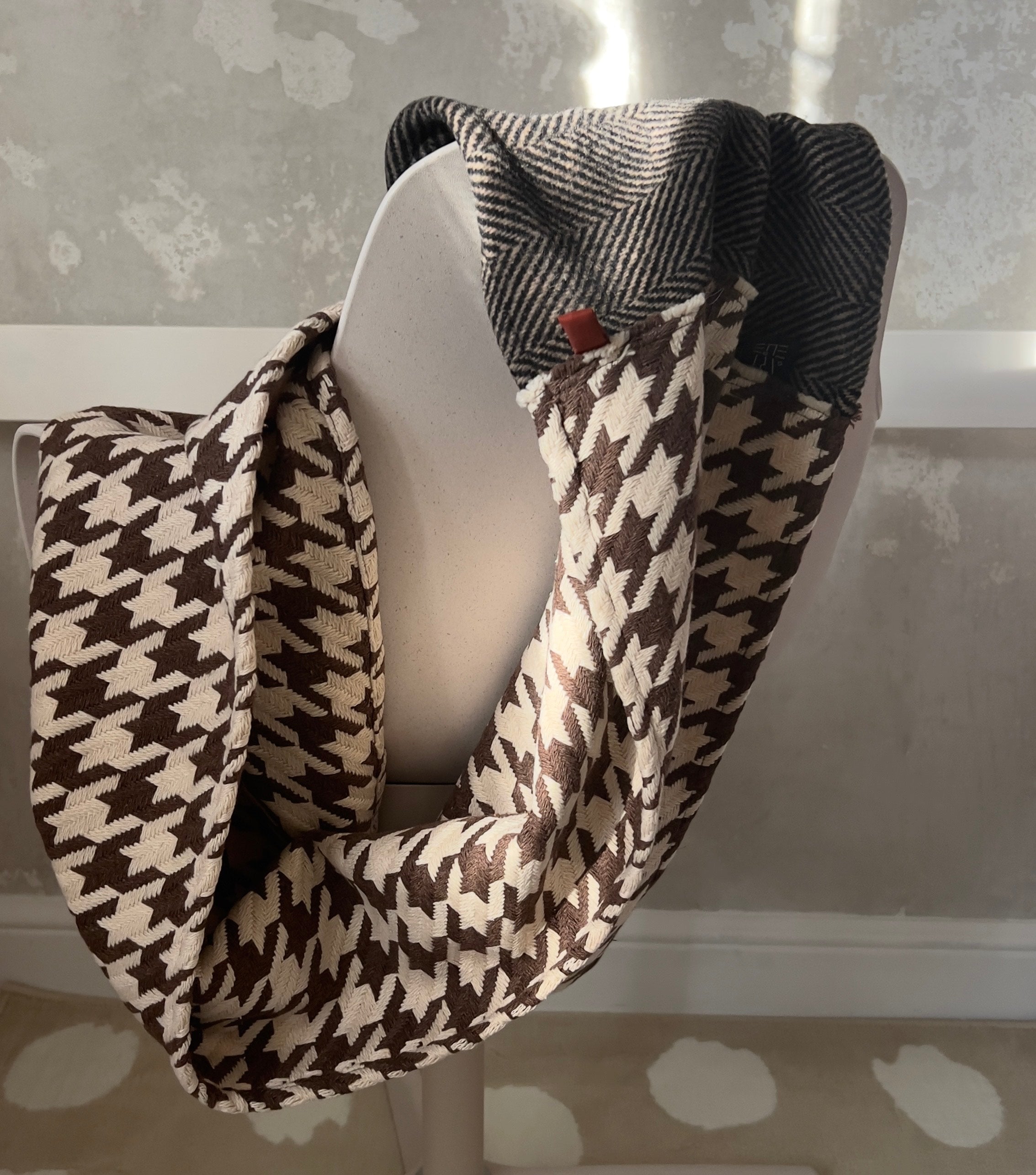 Crafting:  Designed and handmade by Artelie - long, cozy and warm reversible unisex scarf  Unique design created in limited series Model:  Double-faced, large infinity scarf - wear on both sides Slip-on twice and pull up as a hood (it’s huge enough) Spacious, warm, comfortable Christmas Gift favorite Material:  Soft warm wool and cotton woven fabric in white and brown shepherd’s...