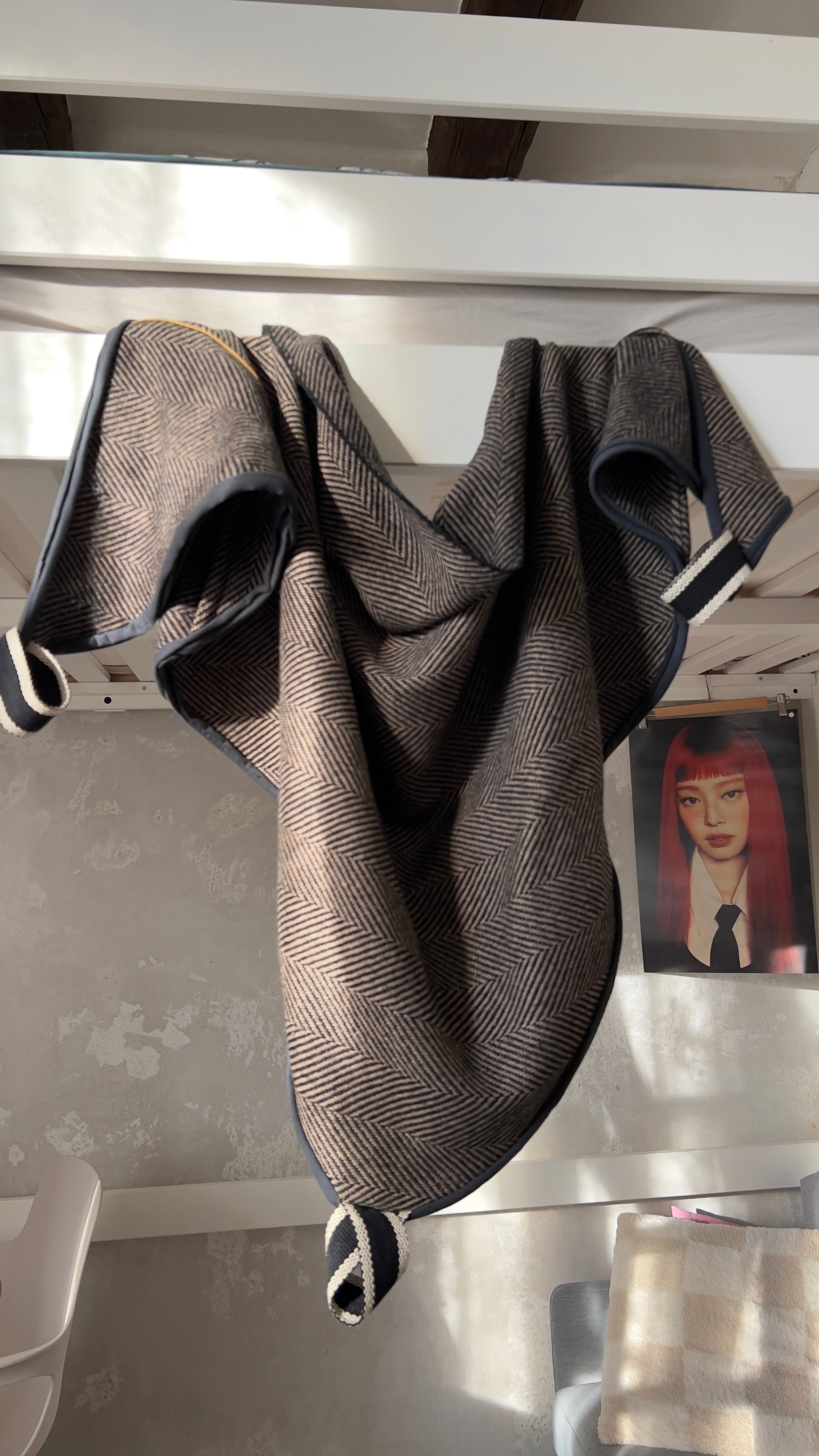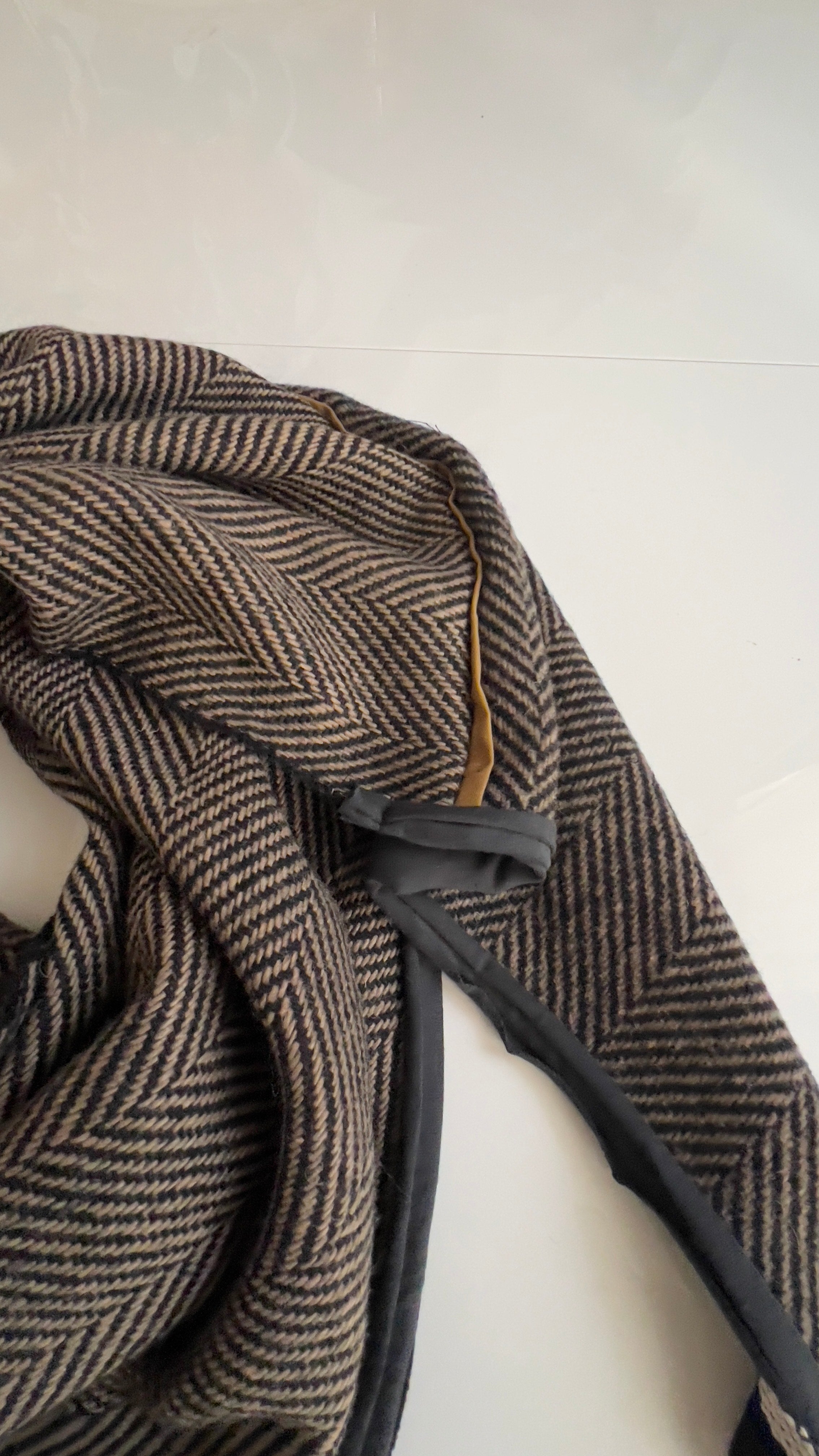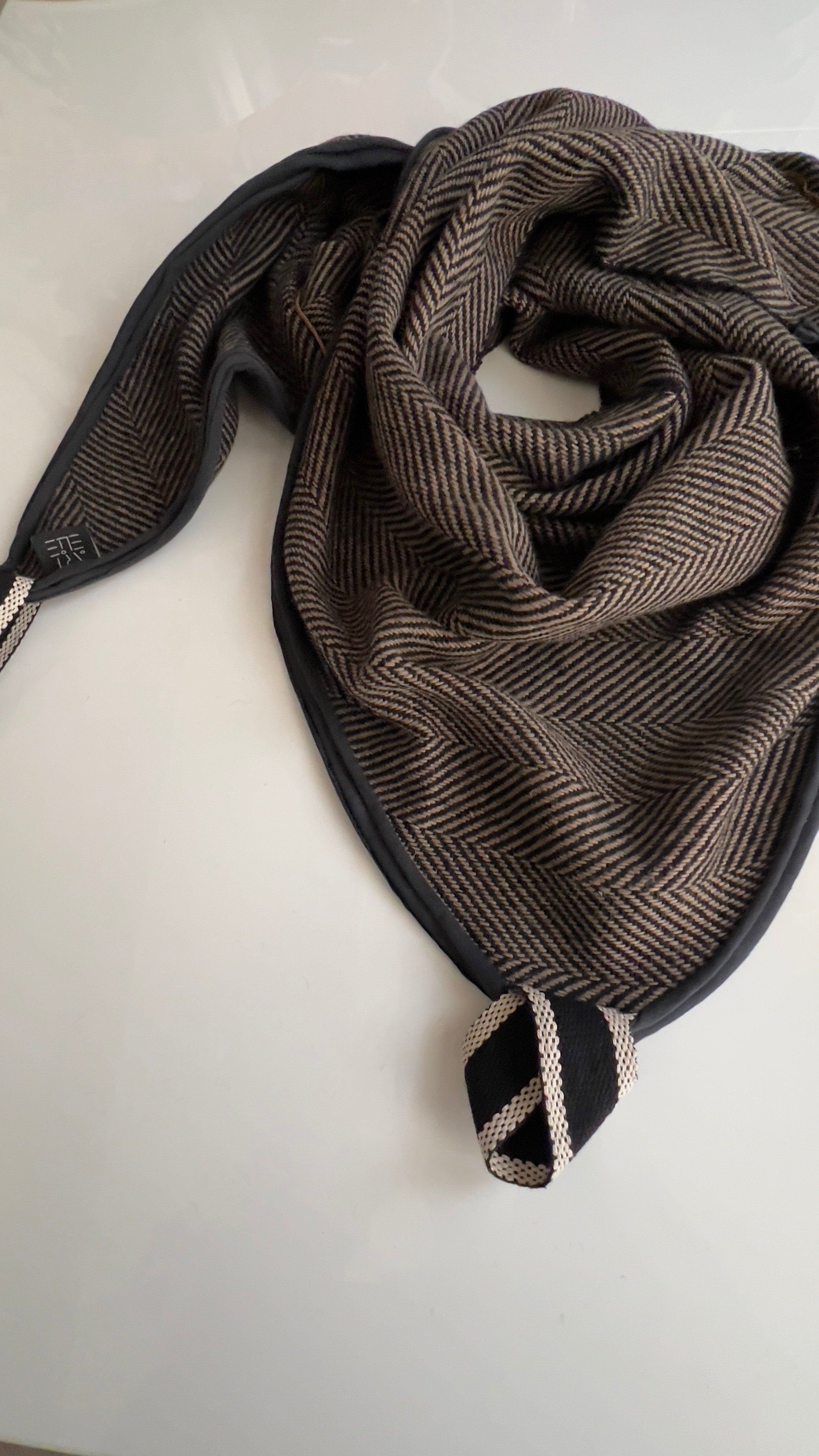 Crafting:  Designed and handmade by Artelie - long, cozy and warm reversible unisex scarf  Unique design created in limited series Model:  Large triangle scarf Christmas Gift favorite Material:  Huge warm wool triangle scarf in brown herringbone pattern. Author details and wide black/white striped hooks in the tree angles