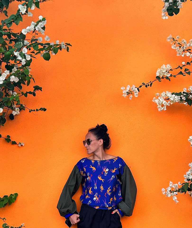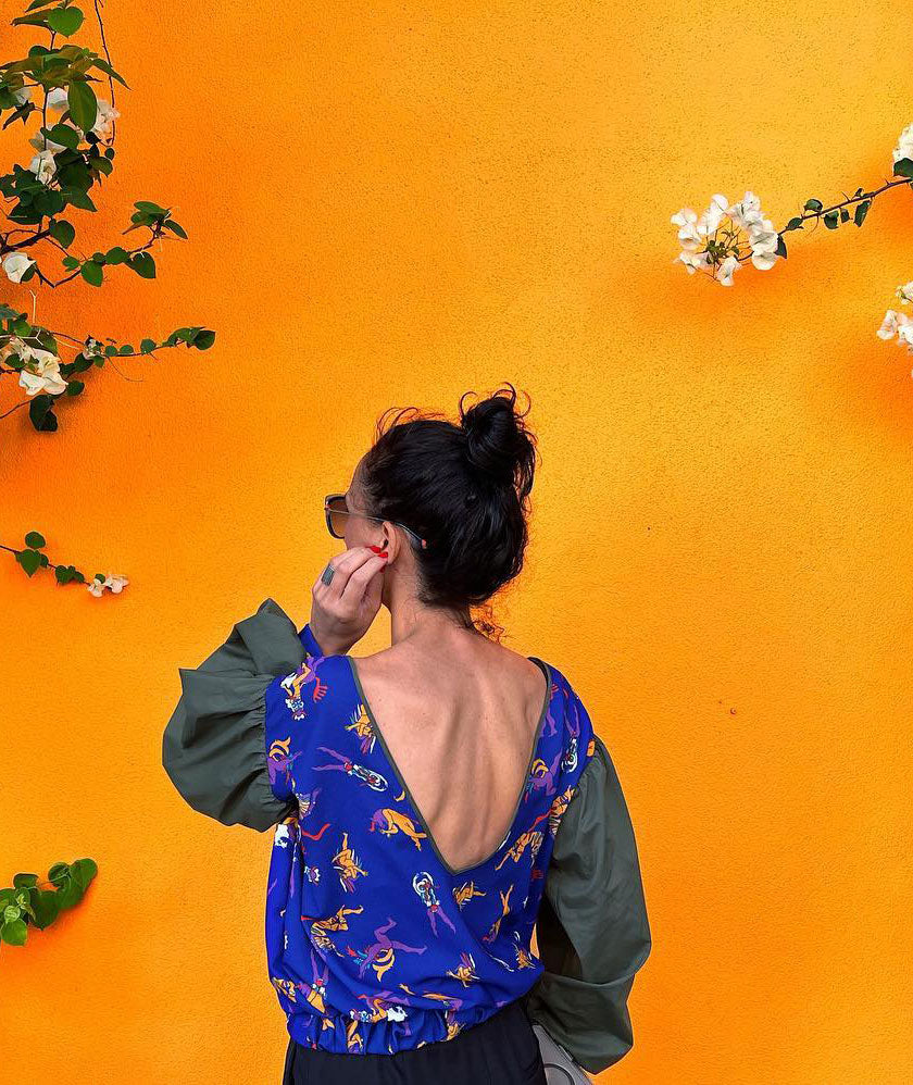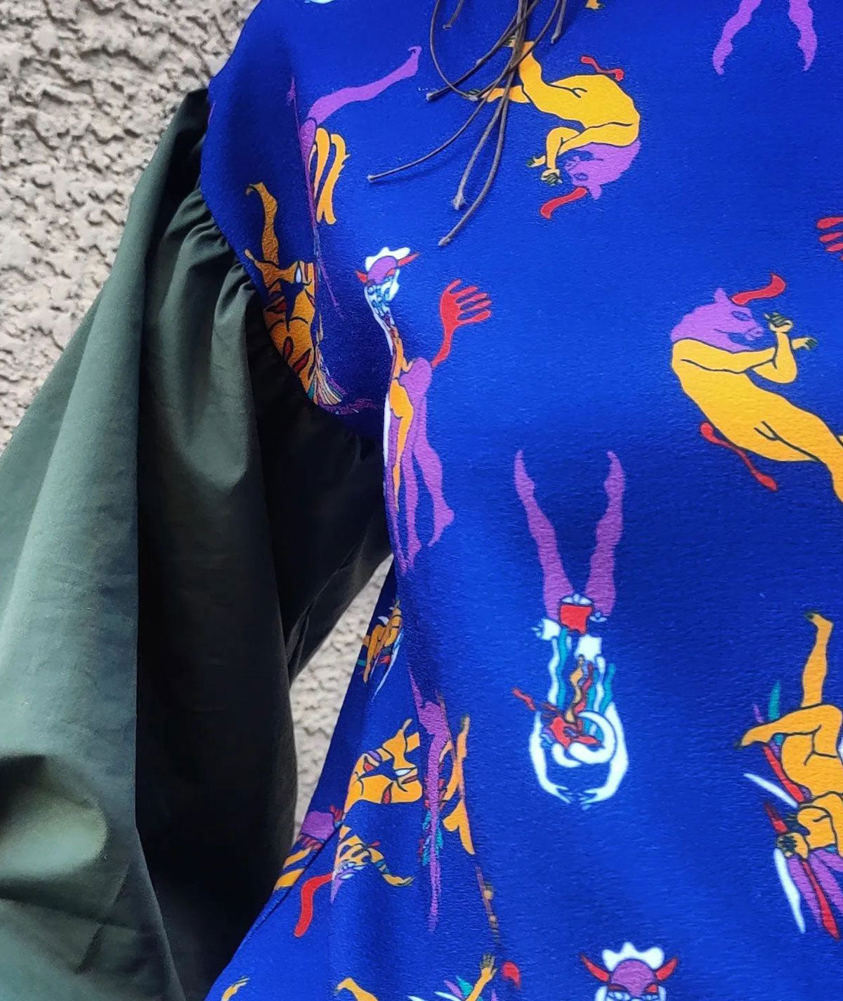 Designer top with puffed sleeves, exclusive design printed fabric, hand crafted by Hellena for Collection Superheroes